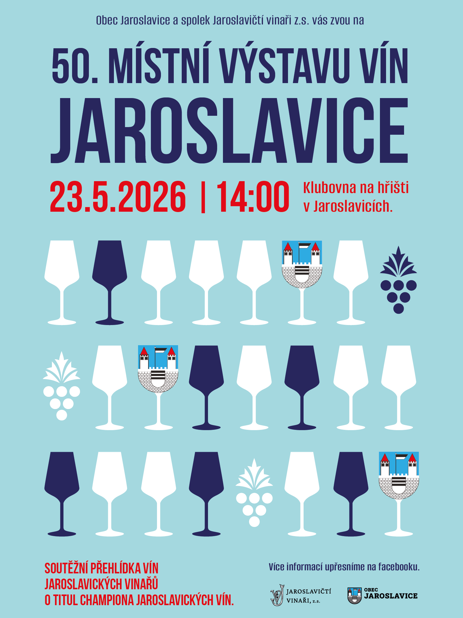 Toužíte po ochutnávce #jaroslavických vín od našich vinařů, a to vše na jednom místě? Máte jedinečnou příležitost, která se opakuje maximálně jednou za 50 (opakujeme slovy: padesát) let! Přijeďte do Jaroslavic 23. 5. 2026 a zažijte neopakovatelný večer 50. místní výstavy vín, věnované výhradně jaroslavickým vínům.